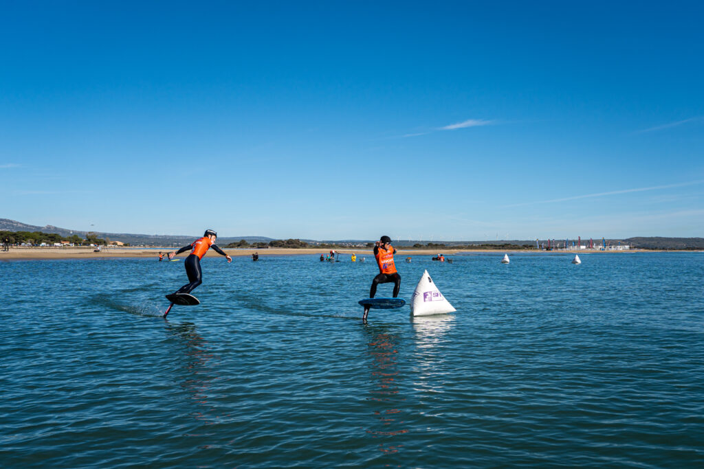 3. Turning and Maneuverability: Even without waves, Pump Foil athletes must navigate courses that include buoys, slaloms, or marked channels. Executing tight, controlled turns at speed while maintaining flight—without falling back into the water—is a critical skill.
